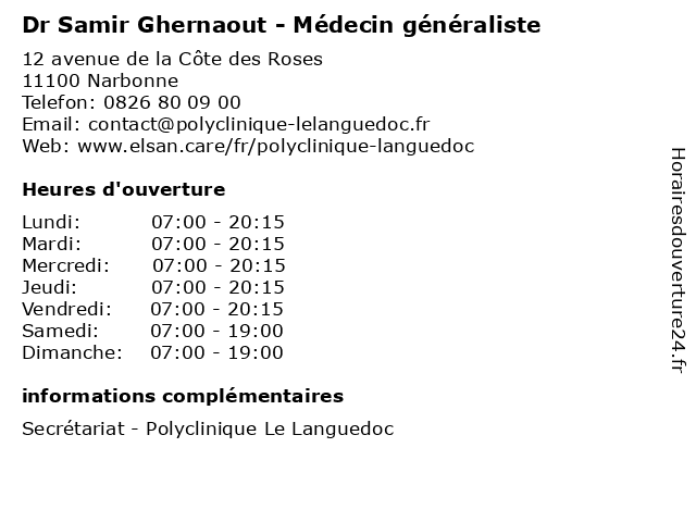 | Lundi | 07:00-20:15 |