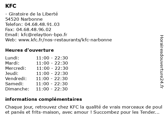 2 Kentucky Fried Chicken (Distance: 0,25 km) Kentucky Fried Chicken Lieudit St Cres, 11100 Narbonne chicken, france, fried, kentucky, kfc, restaurants 3 Pedrero - Fournisseur de produits alimentaires (Distance: 0,56 km) 21 Rue du Rec de veyret, 11100 Narbonne alimentaires, boulangeries, de, fournisseur, pedrero, produits, pâtisseries 4 KFC Béziers (Distance: 28,43 km) 53 Avenue de la Voie Domitienne, 34500 Béziers burgers et buckets, béziers, fastfood, frites, kfc, poulet et bucket, restaurant 5 KFC Perpignan Rivesaltes (Distance: 44,72 km) 1 Rue Max Linder, 66600 Rivesaltes burgers et buckets, fastfood, frites, kfc, perpignan, poulet et bucket, restaurant, rivesaltes 6 |