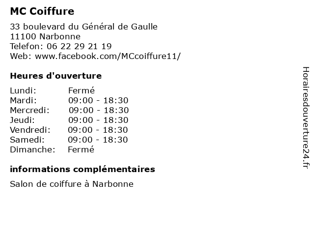 2 ELF'ELLA Coiffure (Distance: 0,57 km) 24 Avenue de Lattre de Tassigny, 11100 Narbonne coiffure, elf'ella 3 Morpho Coiffure (Distance: 0,64 km) 2 Rue de la Parerie, 11100 Narbonne coiffeur, coiffure, couleur, coupe, morpho, salon 4 Eric Zemmour Coiffure (Distance: 0,77 km) 4 Avenue pierre et marie curie, 11100 Narbonne coiffeur, coiffure, eric, eric zemmour, narbonne, zemmour 5 Royal Coiffure (Distance: 0,83 km) 13 Place Voltaire, 11100 Narbonne beauté, coiffure, coiffures, coloristes, royal 6 Régine B Coiffure (Distance: 1,23 km) 17 avenue Anatole France, 11100 Narbonne coiffure, mixte, régine |
