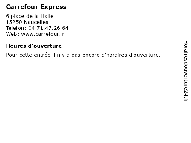 1 Carrefour Express (Distance: 0,04 km) 6 Place De La Halle, 15250 Naucelles-Reilhac carrefour, convenience stores, express, festpreisnachlässe, hypermärkte, supermärkte 2 Sud Express (Distance: 3,90 km) 2 Rue Emile Duclaux, 15000 Aurillac chaussures, express, femme, homme, jeans, pantalons, sud, tendances, vetements 4 Carrefour Location Contact (Distance: 4,15 km) - Avenue de la Plaine, 15250 Jussac automobiles, carrefour, contact, déménagements, location, véhicules 5 Cash Express (Distance: 5,23 km) 41 Avenue des Volontaires, 15000 Aurillac achat, bijoux, cash, d'achats, de, express, franchise, salle, vente 6 |