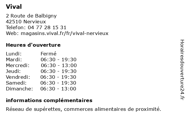 1 Vival (Distance: 4,13 km) n/a Grande Rue, 42510 Neronde bread, deli, fish shop, gas bottles, photocopy, removing packages, vival, wine cellar 2 Vival (Distance: 7,36 km) 192 Rue Saint-Pierre, 42810 Rozier-en-Donzy alimentation, distributeur alimentaire, supermarché, supérette, vival, épicerie 3 Vival (Distance: 13,66 km) 2 Place de Verdun, 42260 Saint-Germain-Laval alimentation, distributeur alimentaire, supermarché, supérette, vival, épicerie 4 Vival (Distance: 13,84 km) 22 Route du Boussuivre, 42780 Violay alimentaire, discount, distributeur, distribution, fruits, grande, hypermarché, légumes, supermarché, vival, épicerie 5 Vival (Distance: 14,66 km) 80 Route Nationale 7, 42470 Saint-Symphorien-de-Lay alimentation, distributeur alimentaire, supermarché, supérette, vival, épicerie 6 Vival (Distance: 17,14 km) n/a Le Bourg, 42123 Cordelle bread, deli, fish shop, gas bottles, photocopy, removing packages, vival, wine cellar  |