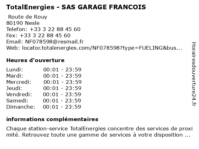 Termes de recherche pour TotalEnergies - SAS GARAGE FRANCOIS:garage, francois, sas, total, gas station, station service, tankstelle, totalenergies |