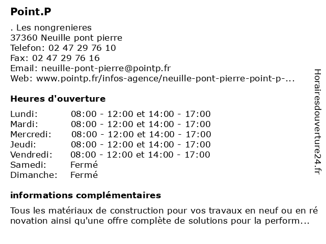 1 Point.P (Distance: 17,83 km) . ZA du Papillon, 37210 Parçay-Meslay accessoires, contructiont, electricité, materiaux, plomberie, point.p, sanitaire outils, équipement 2 Point.P (Distance: 19,39 km) . Route du Mans, 72500 Château-du-Loir aménagement, construction, matériaux, point, point.p, quinçaillerie, équipement 3 Vm Materiaux (Distance: 17,00 km) 2 Rue Jean Monnet, 37390 Notre Dame D’Oé constructives, equipements, materiaux, services, vm 4 Vm Matériaux (Salle d'Exposition) (Distance: 18,74 km) 90 Rue Georges Méliès, 37100 Tours constructives, d'exposition, equipements, expo, materiaux, matériaux, salle, services, vm 5 Vm Matériaux (Distance: 18,74 km) 90 Rue Georges Méliès, 37100 Tours constructives, equipements, materiaux, matériaux, professionnels, services, vm 6 Point.P (Distance: 30,02 km) . Route Nationale 10, 37110 Château-Renault aménagement, equipement, loisirs, materiaux-construction, point, point.p |