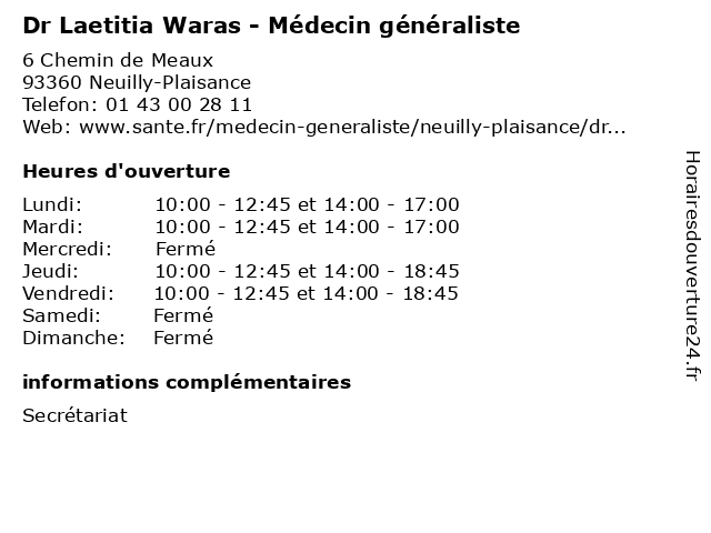 1 Dr Laetitia Tourteau - Pédiatre - secrétariat (Distance: 3,36 km) 2 Rue des Pères Camilliens, 94360 Bry-sur-Marne consultation, docteur, dr, laetitia, med, médecin, médecine, pédiatre, secrétariat, tourteau, traitement 2 Maître Laetitia Saurin - Avocate (Distance: 5,35 km) 60 Boulevard Rouget de Lisle, 93100 Montreuil-sous-Bois avocate, avocats, civils, droits, juridiques, laetitia, maître, saurin 3 Dr Laetitia Maleplate - Chirurgien-dentiste (Distance: 6,19 km) 127 Avenue du Centenaire, 94210 Saint-Maur-des-Fossés chirurgien, consultation, dentiste, docteur, dr, laetitia, maleplate, med, médecin, médecine, traitement 4 Dr Laetitia Elbaz - Chirurgien-dentiste - secrétariat (Distance: 6,29 km) 125 Rue du Maréchal Leclerc, 94410 Saint-Maurice chirurgien, dentiste, dr, elbaz, laetitia, médecins, médicaments, santé, secrétariat, spécialiste 5 Dr Laetitia Komjati - Médecin généraliste (Distance: 7,32 km) 43 Avenue du Bac, 94210 Saint-Maur-des-Fossés docteur, dr, generaliste, généraliste, komjati, laetitia, medical, médecin, soin 6 Salon de Coiffure Laetitia F. (Distance: 7,52 km) 4 avenue Mesnil, 94210 La Varenne Saint Hilaire cheveux, coiffeur, coiffure, de, f., laetitia, salon |