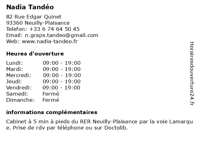 1 Maître Nadia Didi - Avocate (Distance: 0,84 km) 2 boulevard Aristide Briand, 93330 Neuilly sur Marne avocate, avocats, civils, didi, droits, juridiques, maître, nadia 2 Maître Nadia Khater - Avocate (Distance: 3,02 km) 4 avenue du Raincy, 93250 Villemonble avocate, avocats, civils, droits, juridiques, khater, maître, nadia 3 Nadia Battah - Sage-femme - secrétariat (Distance: 3,22 km) 15 Rue Jean Allemane, 93110 Rosny-sous-Bois battah, femme, médecins, médicaments, nadia, sage, santé, secrétariat, spécialiste 4 Dr Nadia Jean-Baptiste - Chirurgien-dentiste (Distance: 4,99 km) 148 Avenue Jean Jaurès, 93320 Les Pavillons-sous-Bois baptiste, chirurgien, dent, dentiste, docteur, dr, jean, nadia, soins 5 Dr Nadia d'Ovidio - Pédiatre (Distance: 6,11 km) 7 Avenue des Arts, 94100 Saint-Maur-des-Fossés bebe, cabinet, d'ovidio, de, des, dr, fossés, maur, nadia, nourisson, pédiatre, pédiatrie, saint 6 Dr Nadia Kebaili - Orthodontiste - secrétariat (Distance: 6,42 km) 4 Avenue Henri Varagnat, 93140 Bondy consultation, docteur, dr, kebaili, med, médecin, médecine, nadia, orthodontiste, secrétariat, traitement |