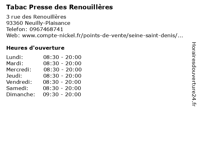 1 Nespresso (Tabac Presse Loto PMU) (Distance: 0,03 km) 3 Rue Des Renouilleres, 93360 Neuilly Plaisance accessories, coffee, loto, machines, nespresso, pmu, points de recyclage, presse, services, tabac 2 Tabac Presse (Distance: 1,41 km) 25 Rue Benoni Eustache, 93250 Villemomble e-liquides, electronique, journaux, presse, tabac, vap, vapoteuse 3 Tabac (Distance: 2,29 km) . Avenue du Général-de-Gaulle, 93117 Rosny-Sous-Bois beaute, cafe, chaussures, enfants, hommes, lingerie, mode femmes, restaurant, sport, tabac 4 Mag Presse (Distance: 2,31 km) 80 Rue Jean Mermoz, 93110 Rosny s/s bois mag, magazine, presse, services 5 Maison de La Presse (Distance: 2,55 km) 139 Avenue du Général de Gaulle, 94170 Le perreux/marne cadeaux, carterie, confiserie-boissons-, de, jeux, la, librairie, maison, papeterie, pmu, presse, tabac 6 AGORA Presse (Distance: 3,66 km) 107 rue C. De Gaulle, 94130 Nogent sur Marn agora, books, press shop, presse, stationery |