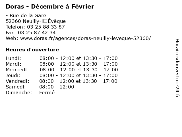 1 Doras - Décembre à Février (Distance: 11,32 km) - Rue Vernier et Collot, 52200 Langres cloisons, de, doras, décembre, fin, février, menuiserie, outillage, travaux 2 Doras - Eté - Mars à Novembre (Distance: 0,00 km) - rue de la Gare, 52360 Neuilly-l'Evêque construction, de, doras, eté, fin, mars, matériaux, novembre, renovation 3 Office de Tourisme - Mars, Octobre à Décembre (Distance: 10,23 km) - Square Olivier Lahalle, 52200 Langres d'octobre, de, décembre, en, et, horaires des musées, mars, octobre, office, restaurants, tourisme, transports 4 Office de Tourisme - Janvier et février (Distance: 10,24 km) - Square Olivier Lahalle, 52200 Langres de, et, février, horaires des musées, janvier, office, restaurants, tourisme, transports 6 In Extenso (De fin novembre à fin février ) (Distance: 12,68 km) 4 rue Lieutenant Didier, 52200 Saints-Geosmes administratifs, agences, comptables, de, extenso, fin, fiscaux et sociaux, février, in, juridiques, novembre, services |