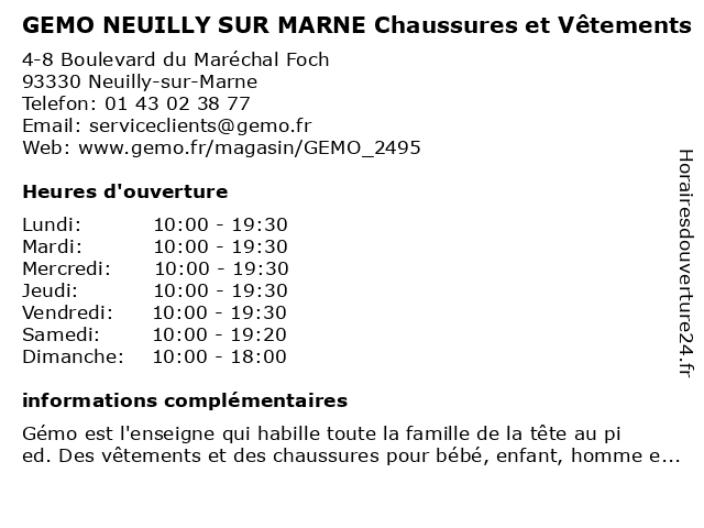 1 GEMO BONDY Chaussures et Vêtements (Distance: 6,62 km) 105 Avenue Gallieni, 93140 Bondy bijoux et accesoires, bondy, chaussures, et, gemo, lingerie, magasin bébé, maroquinerie, mode et habillement, vêtements, vêtements bébé, vêtements enfant, vêtements femme, vêtements homme 2 IDEAL chaussures (Distance: 6,97 km) 85 Route de Provins, 94436 Chennevieres accessories, beaute, bijoux, chaussures, enfant, ideal, mode femme, mode homme, restaurants, services, sport 3 Impulsion Chaussures (Distance: 6,97 km) 85 Route de Provins, 94436 Chennevieres sur Marne beaute, cafe, chaussures, enfants, impulsion, lingerie, mode femmes, mode hommes, restaurant, sport 4 Deuxième Comptoir - Dépôt Vente Vêtements (Distance: 7,09 km) 61 rue Barbès, 93100 Montreuil boutique, chaussures, comptoir, deuxième, dépôt, maroquinerie, occasion, vente, vêtement, vêtements 5 GEMO CHELLES Chaussures et Vêtements (Distance: 7,24 km) Avenue du Gendarme Casterman, 77500 Chelles bijoux et accesoires, chaussures, chelles, et, gemo, lingerie, magasin bébé, maroquinerie, mode et habillement, vêtements, vêtements bébé, vêtements enfant, vêtements femme, vêtements homme 6 La Halle aux Chaussures (Distance: 8,18 km) 148 Rue d'Avron, 75020 Paris aux, chaussures, femme, halle, homme, la, magasin, vetement |