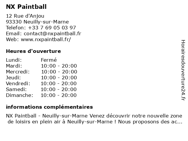 1 Step Dance - Danse Orientale Tous Nx (Distance: 11,27 km) 12 Avenue Jean Aicard, 75011 Paris centre, cours, dance, danse, gym, l'exercice, muscles, nx, orientale, santé, sport, step, tous 3 Nolimit Aventure - Du 1er septembre au 30 avril Congé Scolaire (Distance: 18,82 km) - D216 Route de Gretz, 77173 Chevry-Cossigny 1er, 30, accrobranche, au, aventure, avril, congé, du, evasion, laser game, loisirs extérieur, nolimit, paintball, scolaire, septembre 4 Paintball Camp (Distance: 20,35 km) 15 Rue d'Estienne d'Orves,, 92130 Paris camp, paintball, paintball store 5 Paintball Select (Distance: 31,34 km) 6 Rue de la Closerie, 91090 Lisses magasin, paintball, select, sport 6 Nolimit Aventure - Du 1er mai au 31 août (Distance: 33,63 km) - Route de Milly, 91830 Le Coudray-Montceaux 1er, 31, accrobranche, août, au, aventure, du, evasion, laser game, loisirs extérieur, mai, nolimit, paintball, parc de loisirs |