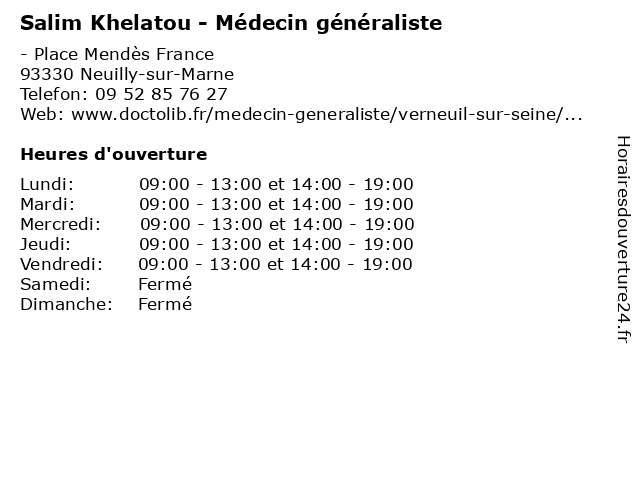 | Lundi | 09:00-13:00 et 14:00-19:00 |