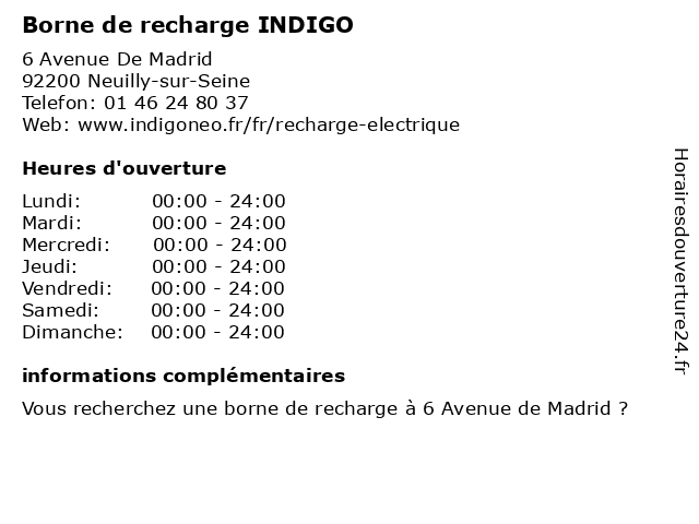 1 Borne de recharge INDIGO (Distance: 0,59 km) 80 Avenue Charles De Gaulle, 92200 Neuilly-sur-Seine borne, de, indigo, recharge 2 Borne de recharge INDIGO (Distance: 1,07 km) 1 Place De Bagatelle, 92200 Neuilly-sur-Seine borne, de, indigo, recharge 3 Borne de recharge INDIGO (Distance: 1,14 km) 31 Boulevard D'inkermann, 92200 Neuilly-sur-Seine borne, de, indigo, recharge 4 Borne de recharge INDIGO (Distance: 1,39 km) 43 Avenue Du Roule, 92200 Neuilly-sur-Seine borne, de, indigo, recharge 5 Borne de Recharge INDIGO (Distance: 1,74 km) 2 Place De La Porte Maillot, 75017 PARIS borne, de, indigo, recharge 6 Borne de recharge INDIGO (Distance: 1,79 km) 19 Avenue De La Division Leclerc, 92800 Puteaux borne, de, indigo, recharge |