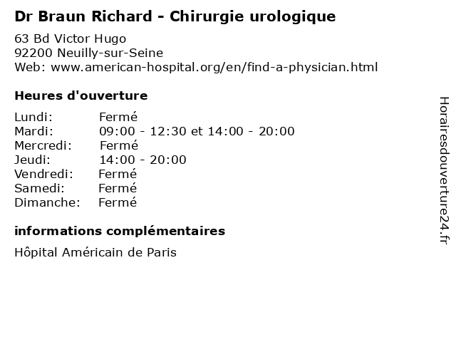 1 Hôpital Américain de Paris - Horaires de visite - Maternité & Médecine/Chirurgie (Distance: 0,00 km) 63 Boulevard Victor Hugo, 92200 Neuilly-sur-Seine américain, bureau, consultation, de, dr, horaires, hôpital, la maladie, la médecine, la pratique, maternité, med, médecin, médecine/chirurgie, paris, thérapie, traitement, visite 2 Dr. Bui Patrick - Chirurgie plastique reconstructrice et esthétique (Distance: 0,00 km) 63 Bd Victor Hugo, 92200 Neuilly-sur-Seine bui, chirurgie, chirurgie plastique reconstructrice et esthétique, consultations, dr., esthétique, et, patrick, plastique, reconstructrice 3 Dr. Bellier Guy - Chirurgie orthopédique et traumatologie (Distance: 0,00 km) 63 Bd Victor Hugo, 92200 Neuilly-sur-Seine bellier, chirurgie, chirurgie orthopédique et traumatologie, consultations, dr., et, guy, orthopédique, traumatologie 4 Dr. Duranthon Louis Denis - Chirurgie orthopédique et traumatologie (Distance: 0,00 km) 63 Bd Victor Hugo, 92200 Neuilly-sur-Seine chirurgie, chirurgie orthopédique et traumatologie, consultations, denis, dr., duranthon, et, louis, orthopédique, traumatologie 5 Dr. Tripon Philippe - Chirurgie orthopédique et traumatologie (Distance: 0,00 km) 63 Bd Victor Hugo, 92200 Neuilly-sur-Seine chirurgie, chirurgie orthopédique et traumatologie, consultations, dr., et, orthopédique, philippe, traumatologie, tripon 6 Dr. Van Gaver Edouard - Chirurgie orthopédique et traumatologie (Distance: 0,00 km) 63 Bd Victor Hugo, 92200 Neuilly-sur-Seine chirurgie, chirurgie orthopédique et traumatologie, consultations, dr., edouard, et, gaver, orthopédique, traumatologie, van |