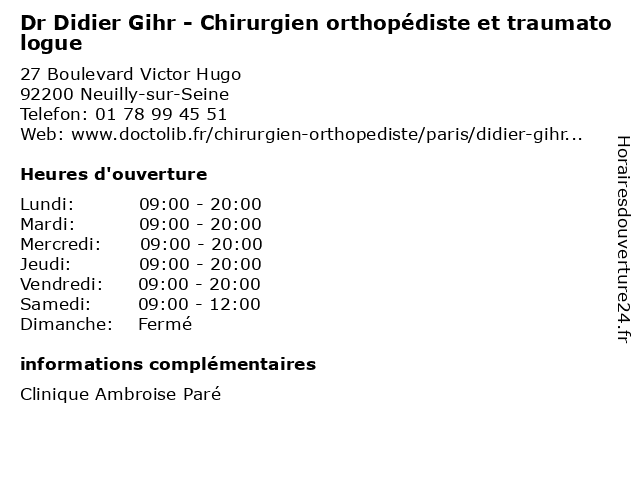 1 Dr Didier Gihr - Chirurgien orthopédiste et traumatologue (Distance: 2,43 km) 22 bis Rue Georges Bizet, 75116 Paris chirurgien, consultation, didier, docteur, dr, et, gihr, med, médecin, médecine, orthopédiste, traitement, traumatologue 2 Dr Cyril Dauzac - Chirurgien orthopédiste et traumatologue (Distance: 0,00 km) 27 Boulevard Victor Hugo, 92200 Neuilly-sur-Seine chirurgien, consultation, cyril, dauzac, docteur, dr, et, med, médecin, orthopédiste, traitement, traumatologue 3 Olivier Le Moullac - Orthopédiste-orthésiste (Distance: 0,02 km) 25-27 Boulevard Victor Hugo, 92200 Neuilly-sur-Seine le, medecin, moullac, olivier, ortho, orthoptiste, orthopédiste, orthésiste, sante 4 Dr Francois Borrel - Chirurgien orthopédiste et traumatologue (Distance: 0,02 km) 25 Boulevard Victor Hugo,, 92200 Neuilly-sur-Seine borrel, chirurgien, docteur, dr, et, francois, orthopédiste, sante, soins, traumatologue 5 Dr Didier Pierron - Neurochirurgien (Distance: 0,04 km) 27 Boulevard Victor Hugo, 92200 Neuilly-sur-Seine cerveau, didier, dr, nerf, neurochirurgien, neurologie, neurologue, pierron 6 Dr Didier Leclerc - Anesthésiste réanimateur (Distance: 0,13 km) 26 Boulevard Victor Hugo, 92200 Neuilly-sur-Seine anesthésie, anesthésiste, anesthésistes, didier, dr, leclerc, réanimateur, réanimateurs |