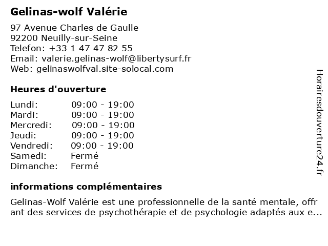 1 Valérie Gelinas-Wolf - Psychologue (Distance: 0,00 km) 97 Avenue Charles de Gaulle, 92200 Neuilly-sur-Seine cabinets, gelinas, médecins, psychologue, secrétariat, thérapies, valérie, wolf 2 L'Optic by Valérie (Distance: 0,88 km) 2 place de la Porte Maillot, 75017 Paris by, l'optic, lentilles, lunettes, opticien, optique, solaire, valérie, vue 3 Dr Nathalie Wolf - Chirurgien-dentiste (Distance: 1,74 km) 19 Avenue Victor Hugo, 75116 Paris chirurgien, dentaire, dentiste, dr, implantologie, nathalie, parodontologie, wolf 4 Dr Valérie Vuillemin - Radiologue (Distance: 1,78 km) 5 bis rue du Dôme, 75116 Paris docteur, dr, médecin, radiologie, radiologue, valérie, vuillemin 5 Valérie Samama - Diététicienne (Distance: 1,84 km) 47 Rue du Président Wilson,, 92300 Levallois-Perret aliment, dieticien, diététicienne, medecin, nutrition, samama, valerie, valérie 6 Gym Suedoise - Paris 16 Lauriston - Valérie P. (Distance: 1,85 km) 74 Rue Lauriston, 75116 Paris 16, centre, club, cours, gym, l'exercice, la santé, lauriston, le sport, les muscles, levallois, p., paris, seniors, sporting, stretch, suedoise, valérie, yoga&gym |