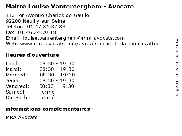 1 Maître Louise Raynaud - Avocate (Distance: 0,06 km) 2-8 Rue Ancelle, 92200 Neuilly-sur-Seine avocate, avocats, civils, droits, juridiques, louise, maître, raynaud 2 Ambre & Louise (Distance: 1,03 km) 2, place de la Porte Maillot, 75017 Paris accessoires, ambre, bijoux, louise, montres 3 Maître Louise Bras - Avocate (Distance: 1,16 km) 61 rue de Villiers, 92200 Neuilly-sur-Seine avocate, avocats, bras, cabinet, conseils, contentieux, juridique, justice, litiges, louise, maître, services 4 Onepark / Louise Michel Parking (Distance: 1,25 km) 6 Rue Louise Michel, 92300 Levallois-Perret louise, michel, onepark, parking, services 5 Dr Louise Alechinsky - Chirurgien urologue (Distance: 1,28 km) 63 Boulevard Victor Hugo, 92200 Neuilly-sur-Seine alechinsky, chirurgie, chirurgien, dr, general, louise, soins, urologue 6 Maître Louise Forget - Avocate (Distance: 1,91 km) 17 Avenue Niel, 75017 Paris avocate, avocats, cabinet, conseils, contentieux, forget, juridique, justice, litiges, louise, maître, services |