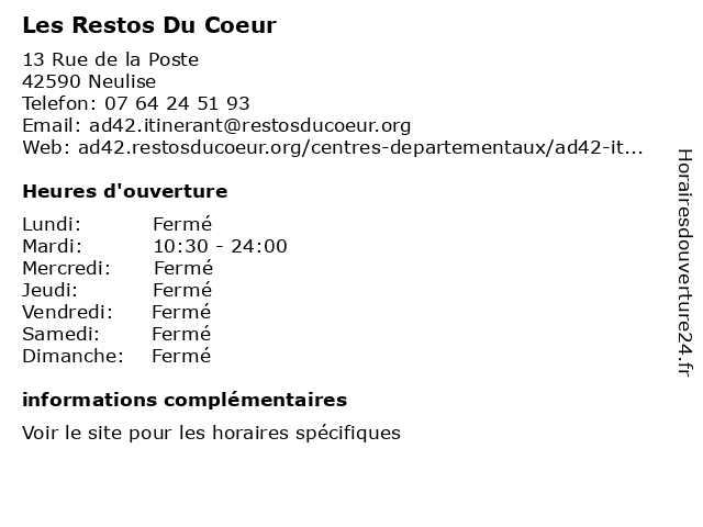 1 Les Restos Du Coeur (Distance: 15,38 km) 89 place du 8 Mai 1945, 42260 Saint-Germain Laval aides, alimentaire, coeur, du, les, restos, santé, solidarité, soutien 2 Les Restos Du Coeur (Distance: 18,86 km) 8 Rue des Artisans, 42300 Roanne aides, alimentaire, coeur, du, les, restos, santé, solidarité, soutien 3 Les Restos Du Coeur (Distance: 19,33 km) 1 bis Boulevard Lamartine, 69170 Tarare aides, alimentaire, coeur, du, les, restos, santé, solidarité, soutien 4 Le Coeur de K (Distance: 19,54 km) 2 avenue Charles de Gaulle, 69170 Tarare accessoires, boutique, coeur, de, habillement, le, mode, vetement 5 Family Sphere (Distance: 42,47 km) 248 Rue de la Paix, 69400 Villefranche / Val de Saone family, garde d'enfants, services, soutien scolaire, sphere 6 Les Restos Du Coeur (Distance: 42,63 km) - Rue Emile Mercier, 42160 Andrézieux-Bouthéon aides, alimentaire, coeur, du, les, restos, santé, solidarité, soutien |