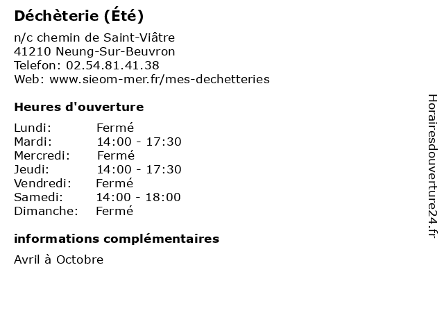 1 Déchèterie (Été) (Distance: 7,45 km) - Route de Marcilly-en-Gault, 41300 Selles-Saint-Denis bennes, débarras, déchèterie, détritus, ordures, été 2 Déchèterie (Été) (Distance: 13,30 km) - Route de Marcilly-en-Gault, 41300 Salbris bennes, débarras, déchèterie, détritus, ordures, été 3 Déchèterie (Été) (Distance: 17,77 km) - route de Chaumont-sur-Tharonne, 41600 Lamotte-Beuvron bennes, débarras, déchèterie, détritus, ordures, été 4 Déchèterie (Hiver) (Distance: 7,45 km) - Route de Marcilly-en-Gault, 41300 Selles-Saint-Denis bennes, débarras, déchèterie, détritus, hiver, ordures 5 Déchèterie (Hiver) (Distance: 13,30 km) - Route de Marcilly-en-Gault, 41300 Salbris bennes, débarras, déchèterie, détritus, hiver, ordures 6 Déchèterie (Hiver) (Distance: 17,77 km) - route de Chaumont-sur-Tharonne, 41600 Lamotte-Beuvron bennes, débarras, déchèterie, détritus, hiver, ordures |