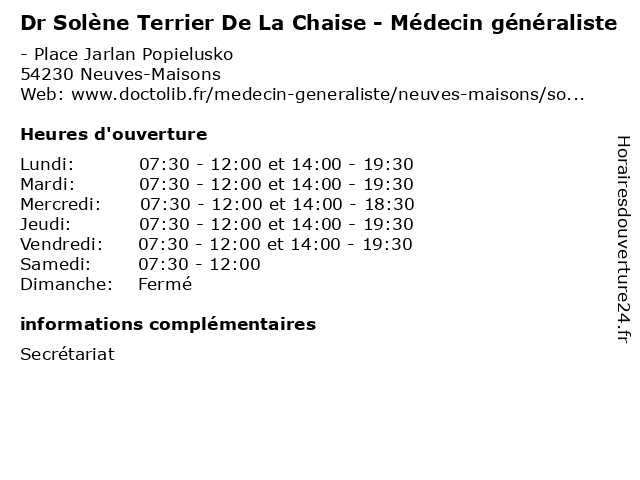 | Lundi | 07:30-12:00 et 14:00-19:30 |