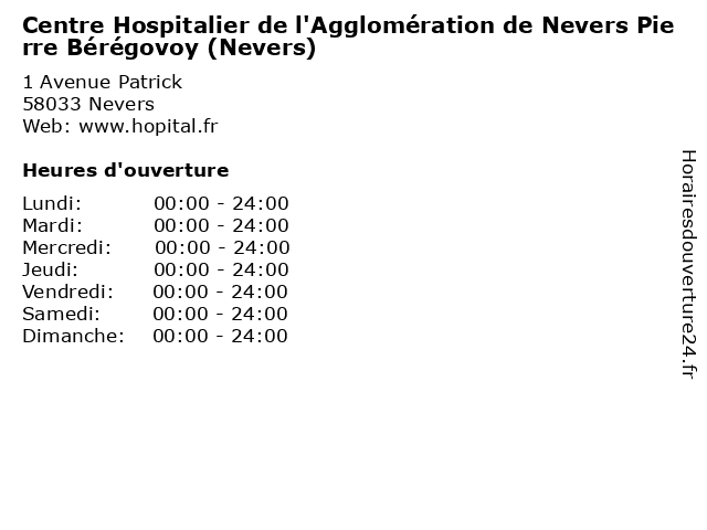 1 Centre Hospitalier de l'Agglomération de Nevers Pierre Bérégovoy (Nevers) (Distance: 0,00 km) 1 Avenue Patrick, 58033 Nevers bérégovoy, centre, de, docteur, hospitalier, l'agglomération, medecins, nevers, pierre, sante |