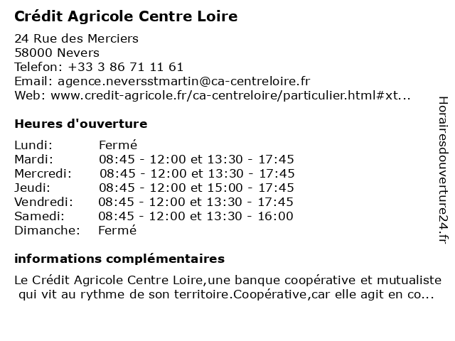 1 Crédit Agricole Centre Loire (Distance: 0,43 km) 1 Rue du Ravelin, 58000 Nevers agricole, centre, crédit, loire 2 Crédit Agricole Centre Loire (Distance: 0,67 km) 46 Avenue Général de Gaulle, 58000 Nevers agricole, centre, crédit, loire 3 Crédit Agricole Centre Loire (Distance: 1,10 km) 41 Boulevard Maréchal de Lattre de Tassigny, 58000 Nevers agricole, centre, crédit, loire 4 Crédit Agricole Centre Loire (Distance: 2,00 km) 92 Rue Henry Bouquillard, 58000 Nevers agricole, centre, crédit, loire 5 Crédit Agricole Centre Loire (Distance: 3,65 km) 89 Boulevard Camille Dagonneau, 58640 Varennes-Vauzelles agricole, centre, crédit, loire 6 Crédit Agricole Centre Loire (Distance: 3,80 km) 2 Route de Paris, 58640 Varennes-Vauzelles agricole, centre, crédit, loire |