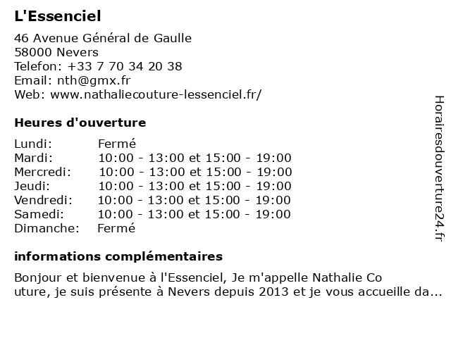 Bonjour et bienvenue à l'Essenciel, Je m'appelle Nathalie Couture, je suis présente à Nevers depuis 2013 et je vous accueille dans ma boutique, 46 avenue du Général de Gaulle à Nevers. J...
