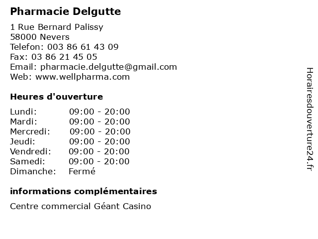 1 Pharmacie Bernamont (Distance: 0,63 km) 87 Rue Francois Mitterrand, 58000 Nevers bernamont, cosmétiques, herboristerie, homéopathie, médicaments, officine, ordonnances, paramédical, parapharmacie, pharmacie, pharmacien, santé, soins, traitements 2 Pharmacie Saint-Antoine (Distance: 2,08 km) 107 Route de Lyon, 58000 Challuy antoine, cosmétiques, herboristerie, homéopathie, médicaments, officine, ordonnances, paramédical, parapharmacie, pharmacie, pharmacien, saint, santé, soins, traitements 3 Pharmacie Collin-Delaquerrière (Distance: 37,62 km) 46 Rue du Docteur Dubois, 58110 Chatillon en Bazois collin, delaquerrière, herboristerie, médicaments, paramédical, parapharmacie, pharmacie, pharmacien, santé, traitements 4 Pharmacie de la Poste (Distance: 45,88 km) 73 Rue de la République, 03000 Avermes de, herboristerie, la, médicaments, paramédical, parapharmacie, pharmacie, pharmacien, poste, santé, traitements 5 Pharmacie Jacques Cœur (Distance: 57,46 km) 16 Bis Rue de Lapparent, 18000 Bourges cœur, herboristerie, jacques, médicaments, paramédical, parapharmacie, pharmacie, pharmacien, santé, traitements 6 Pharmacie Borderie (Distance: 57,76 km) 159 Rue de Turly, 18000 Bourges borderie, herboristerie, médicaments, paramédical, parapharmacie, pharmacie, pharmacien, santé, traitements |
