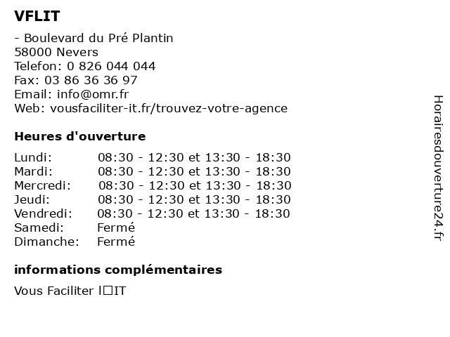 | Lundi | 08:30-12:30 et 13:30-18:30 |