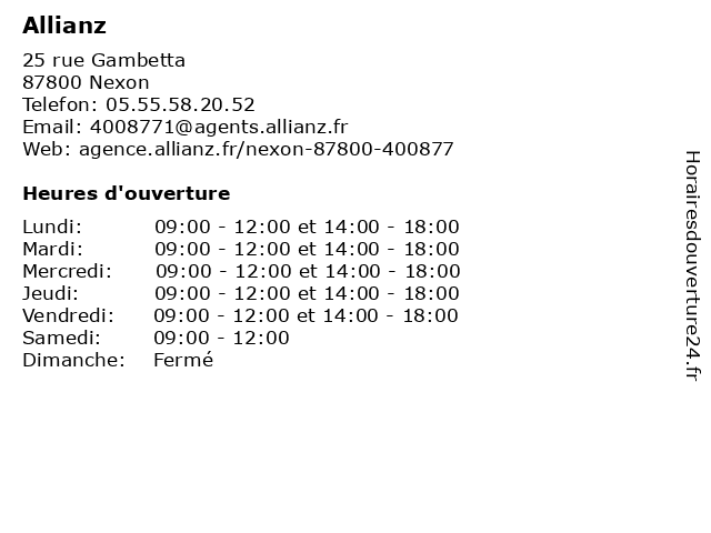 1 Allianz (Distance: 13,51 km) 57 Avenue Wilson, 87700 Aixe Sur Vienne allianz, assurances, bancaire, banque, services 2 Allianz (Distance: 14,96 km) - Rue de la tour, 87110 Le Vigen allianz, assurance prêt, assurances, services 3 Allianz (Distance: 17,47 km) 17 Rue Delescluze, 87000 Limoges allianz, assurance prêt, assurances, services 4 Allianz (Distance: 17,47 km) 3 bis Place des Carmes, 87006 Limoges allianz, assurance prêt, assurances, services 5 Allianz (Distance: 17,56 km) 3 Place d'Aine, 87000 Limoges allianz, assurance prêt, assurances, services 6 Allianz (Distance: 17,61 km) 11 Rue Jeanty Sarre, 87000 Limoges allianz, assurance prêt, assurances, services |