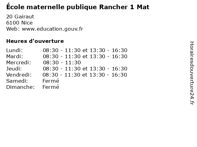 1 École Maternelle Publique Rancher 1 (Distance: 0,68 km) 20 Vieux chemin de Gairaut, 06100 Nice cours, education, maternelle, publique, rancher, services, École, école 2 École élémentaire publique Rancher 2 (Distance: 0,69 km) 22 Vieux chemin de Gairaut, 06100 Nice cours, education, publique, rancher, services, école, élémentaire 3 École primaire Rancher 1 (Distance: 1,21 km) 24 Gairaut, 06100 Nice cours, primaire, rancher, servicios, école 4 École maternelle publique Pessicart Mat (Distance: 1,99 km) 376 Pessicart, 06100 Nice cours, mat, maternelle, pessicart, publique, servicios, école 5 École maternelle publique Hyvert Mat (Distance: 2,13 km) 89 Avenue George V, 06000 Nice cours, hyvert, mat, maternelle, publique, servicios, école 6 École maternelle publique Pasteur Mat (Distance: 2,26 km) 17 Delvalle, 06000 Nice cours, mat, maternelle, pasteur, publique, servicios, école |