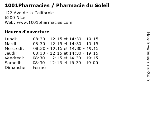 1 Pharmacie du Soleil (Distance: 0,01 km) 122 Avenue de la Californie, 06200 Nice du, herboristerie, médicaments, paramédical, parapharmacie, pharmacie, pharmacien, santé, soleil, traitements 2 3 1001Pharmacies / Société Medicazur (Distance: 1,79 km) 96 Av de la Corniche, 06200 Nice 1001pharmacies, la médecine, la pharmacie, la santé, les soins, medicazur, pharmacie, société 4 1001Pharmacies / Pharmacie Pessicart (Distance: 1,83 km) 147 bd Gambetta, 06000 Nice 1001pharmacies, la médecine, la pharmacie, la santé, les soins, pessicart, pharmacie 5 1001Pharmacies / Société Coiffure BB (Distance: 2,86 km) 5 Boulevard Victor Hugo, 06000 Nice 1001pharmacies, bb, coiffure, la médecine, la pharmacie, la santé, les soins, pharmacie, société 6 1001Pharmacies / Pharmacie des Vosges (Distance: 2,98 km) 136 Bd Gambetta, 06000 Nice 1001pharmacies, des, la médecine, la pharmacie, la santé, les soins, pharmacie, vosges  |