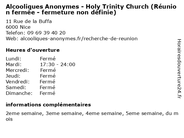 1 Alcooliques Anonymes (Réunion ouverte - fermeture non définie) (Distance: 0,00 km) 11 Rue de la Buffa, 06000 Nice alcooliques, anonymes, définie, fermeture, fermée, non, ouverte, réunion 2 Alcooliques Anonymes (Réunion fermée - fermeture non définie) (Distance: 0,00 km) 11 Rue de la Buffa, 06000 Nice alcooliques, anonymes, définie, fermeture, fermée, non, réunion 3 Alcooliques Anonymes (Réunion fermée - fermeture non définie) (Distance: 1,81 km) 20 Rue Beaumont, 06300 Nice alcooliques, anonymes, définie, fermeture, fermée, non, réunion 4 Alcooliques Anonymes (Réunion ouverte - fermeture non définie) (Distance: 1,81 km) 20 Rue Beaumont, 06300 Nice alcooliques, anonymes, définie, fermeture, fermée, non, ouverte, réunion 5 Alcooliques Anonymes (Réunion fermée - fermeture non définie) (Distance: 8,36 km) 91 Chemin du Val Fleuri, 06800 Cagnes-sur-Mer alcooliques, anonymes, définie, fermeture, fermée, non, réunion 6 Alcooliques Anonymes (Réunion ouverte - fermeture non définie) (Distance: 8,36 km) 91 Chemin du Val Fleuri, 06800 Cagnes-sur-Mer alcooliques, anonymes, définie, fermeture, non, ouverte, réunion |