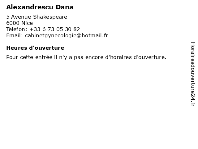 1 Dr Clara Alexandrescu - Cardiologue (Distance: 14,55 km) - Place de la Crémaillère, 06240 Beausoleil alexandrescu, cardiologue, clara, coeur, docteur, dr, sante 2 Orpi - Dana Immobilier (Distance: 20,54 km) 65 Avenue des Frères Roustan, 06220 Le Golfe Juan dana, immobilier, immobiliere, orpi, services 3 Dana Baluteanu - Ophtalmologue (Distance: 51,92 km) 745 Rue du Capitaine Blazy, 83600 Fréjus baluteanu, dana, oeuil, ophtalmologue, sante, vision |