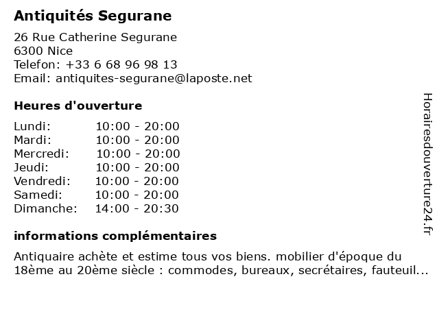 1 Harter Antiquités du XXe siècle (Distance: 0,09 km) 36 Rue Catherine Segurane, 06300 Nice antiquités, art, artists, du, gallery, harter, photos, siècle, xxe 2 Eric Klein - Magasin d'antiquités (Distance: 0,17 km) 4 Rue de Foresta, 06300 Nice antiquité, art, d'antiquités, eric, galerie, klein, luminaire, magasin, nice, sculpture 5 Récamier Antiquités (Distance: 1,89 km) 50 Rue de France, 06000 Nice anciens, antiquaire, antiquité, antiquités, objets, récamier, tableaux 6 Antiquités Tremeaux Stephane (Distance: 2,45 km) 41 Rue Châteauneuf, 06000 Nice antiquités, stephane, tremeaux |