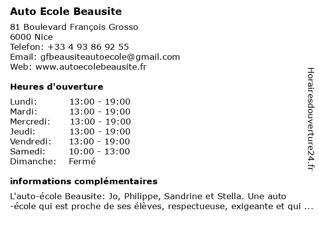 1 Auto-Ecole Chateauneuf (Distance: 0,13 km) 31 Rue Chateauneuf, 06000 Nice auto, auto école, chateauneuf, conduite, cours, ecole, permis, école 2 École maternelle publique - Nice (Distance: 0,83 km) 54 Rue Dabray, 06000 Nice ecole, education, maternelle, nice, publique, services, école 3 Avis (Distance: 0,85 km) 11 Avenue Auber, 06000 Nice auto repair, avis, car rental, car service, parts, truck, truck repair 4 École primaire publique - Nice (Distance: 1,07 km) 32 Rue Clément Roassal, 06000 Nice ecole, education, maternelle, nice, primaire, publique, services, école 5 École elémentaire publique - Nice (Distance: 1,07 km) 32 Rue Clément Roassal, 06000 Nice ecole, education, elémentaire, maternelle, nice, publique, services, école 6 École primaire publique - Nice (Distance: 1,69 km) 189 Route de Pessicart, 06100 Nice ecole, education, maternelle, nice, primaire, publique, services, école |