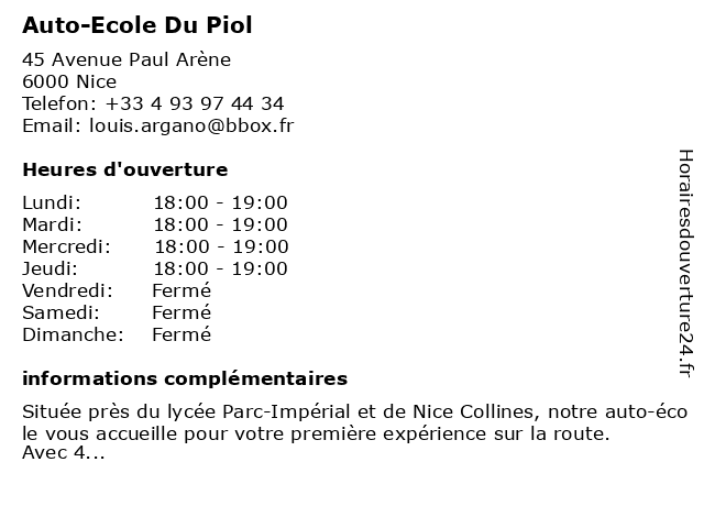 1 Piscine Fernand Anelli – le Piol (hors vacances scolaires) (Distance: 0,07 km) 36 avenue Paul Arène, 06000 Nice anelli, aqua, aquatique, fernand, hors, le, piol, piscine, scolaires, vacances 2 Piscine Fernand Anelli – le Piol (vacances d’été) (Distance: 0,07 km) 36 avenue Paul Arène, 06000 Nice anelli, aqua, aquatique, d’été, fernand, le, piol, piscine, vacances 3 Pharmacie du Piol (Distance: 0,25 km) 2 Avenue Paul Arène, 06000 Nice du, herboristerie, médicaments, paramédical, parapharmacie, pharmacie, pharmacien, piol, santé, traitements 4 Pièces et Pneus (Distance: 0,36 km) 132 Boulevard Gambetta, 06100 Nice auto, distribution, entretien, et, pièce, pièces, pneu, pneus, valve, vente, véhicule 5 Auto-Ecole CER Libération (Distance: 0,73 km) 14 rue Clément Roassal, 06300 Nice auto, auto école, cer, conduite, cours, de, ecole, instructeurs, libération, permis 6 Auto-Ecole Chateauneuf (Distance: 0,95 km) 31 Rue Chateauneuf, 06000 Nice auto, auto école, chateauneuf, conduite, cours, ecole, permis, école |