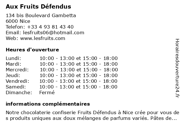 | Vendredi | 10:00-13:00 et 15:00-18:00 |