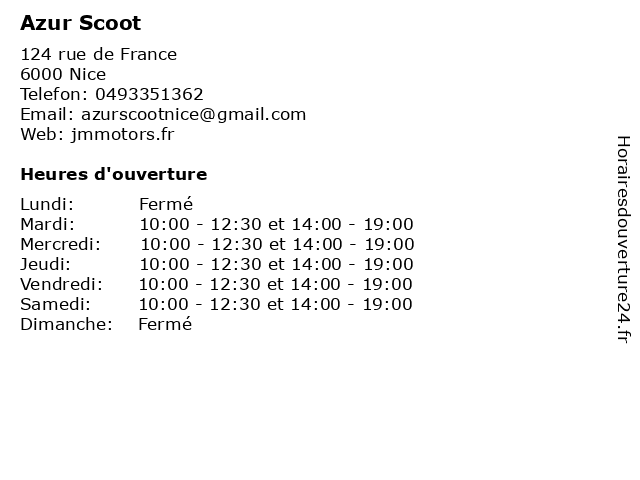 | Mardi | 10:00-12:30 et 14:00-19:00 |