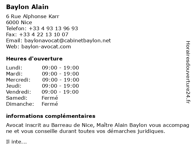 1 Maître Alain Berdah - Avocat (Distance: 0,16 km) 23 rue Maréchal Joffre, 06000 Nice alain, avocat, avocats, berdah, civils, droits, juridiques, maître 2 Dr Pierre-Alain Mandrile - Chirurgien-dentiste (Distance: 0,16 km) 26 Rue du Maréchal Joffre, 06000 Nice alain, chirurgien, dentaire, dentiste, dr, implantologie, mandrile, parodontologie, pierre 3 Maître Alain Castracane - Avocat (Distance: 0,25 km) 11 Rue Gustave Deloye, 06000 Nice alain, avocat, avocate, avocats, castracane, civils, droits, juridiques, maître 4 Alain Afflelou Acousticien (Distance: 0,25 km) 24 Avenue Jean Medecin, 06000 Nice acousticien, afflelou, aide auditive, alain, appareil auditif, prothèses auditive 5 Opticien Nice | Alain Afflelou (Distance: 0,26 km) Centre Commercial Nicetoile, 06000 Nice afflelou, alain, magasin de lunettes de soleil, magasin d’accessoires de mode, nice, opticien, optométrie 6 Audioprothésiste Nice-Alain Afflelou Acousticien (Distance: 0,31 km) Centre Commercial Nicetoile, 06000 Nice acousticien, afflelou, alain, audiologie, audioprothésiste, clinique médicale, nice |