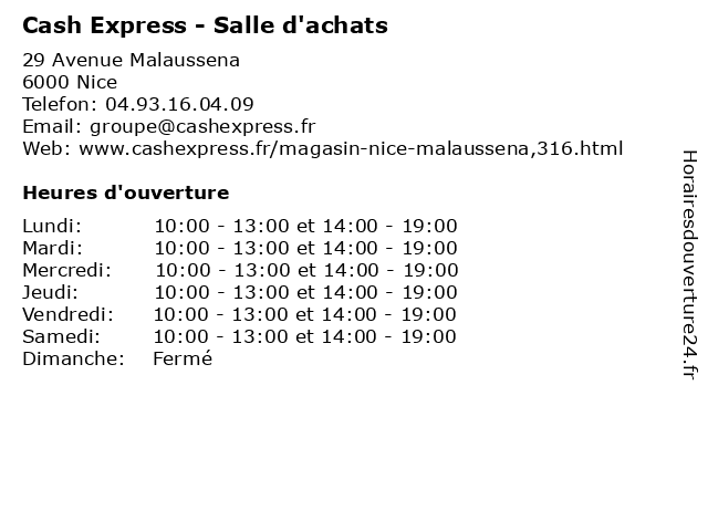 | 1 Cash Express - salle de vente (Distance: 0,00 km) 29 Avenue Malaussena, 06000 Nice achat, bijoux, cash, d'achats, de, express, franchise, salle, vente 2 Carrefour Express (Distance: 0,07 km) 22 Avenue Malaussena, 06300 Nice alimentation, carrefour, express, magasin discount, market, supermarché 3 Cash Alimentaire du Sud-Est (Distance: 0,19 km) 19 & 21 avenue villermont, 06000 Nice alimentaire, cash, du, est, grossiste, nice, sud 4 L'Appart Fitness - salle de sport Nice (Distance: 0,40 km) 45 Rue Clément Roassal, 06000 Nice de, fitness, l'appart, nice, salle, sport 5 Cash Amd (Distance: 0,41 km) 24 boulevard Raimbaldi, 06000 Nice amd, cash, grossiste, hygiène, ménagers, produits 6 Carrefour Express (Distance: 0,44 km) 12 Avenue Thiers, 06008 Nice carrefour, express, gare.station, services |