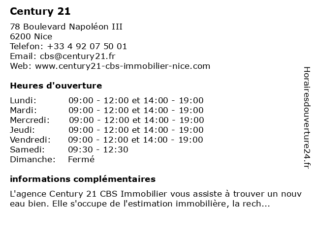 1 Century 21 Etoile Immobilier (Distance: 1,19 km) 74 Avenue Sainte-Marguerite, 06200 Nice 21, century, etoile, immobilier 4 Century 21 - Agence Haton (Distance: 2,36 km) 12 rue de la Buffa, 06000 Nice 21, achat, agence, century, gestion, haton, immobilier, location, vente 5 Century 21 - Cabinet Marchal (Distance: 3,10 km) 83 boulevard Gambetta, 06000 Nice 21, agence, cabinet, century, gestion, immobilière, location, marchal, vente 6 Century 21 - Lafage Transactions (Distance: 3,89 km) 6 rue Alexandre Mari, 06300 Nice 21, agence, century, gestion, immobilière, lafage, location, transactions, vente |