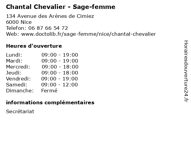 1 Maître Chantal Jamet - Avocate (Distance: 0,28 km) 1 avenue Bellanda, 06000 Nice avocate, avocats, chantal, civils, droits, elziere, jamet, juridiques, maître 2 Chantal Chevalier - Sage-femme - secrétariat (Distance: 0,90 km) 24 Avenue de Flirey, 06100 Nice chantal, chevalier, diagnostic, echographie, femme, maternité, sage, sage-femme, secrétariat 4 Dr. Courtois Chantal - Dermatologue (Distance: 1,38 km) 11 Boulevard Joseph Garnier, 06000 Nice chantal, courtois, dermatologue, docteur, dr., medecins, sante 5 Dr Marie-Chantal Valfort - Gynécologue médicale (Distance: 1,43 km) 20 Boulevard Joseph Garnier, 06100 Nice chantal, docteur, dr, gynecologue, gynécologue, marie, médicale, obstretricien, sante, valfort 6 Marie Chantal Remy Ferraro - Psychologue (Distance: 1,63 km) 34 Rue Clément Roassal, 06000 Nice chantal, ferraro, marie, psy, psychiatre, psychologue, remy, sante, soins |