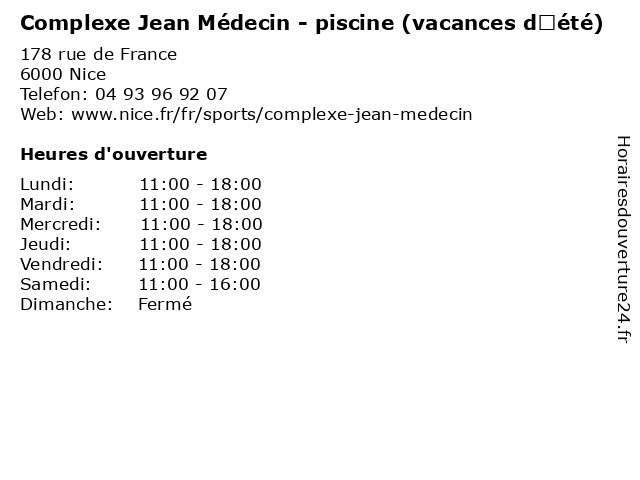 1 Complexe Jean Médecin - piscine (période scolaire) (Distance: 0,00 km) 178 rue de France, 06000 Nice aqua, aquatique, complexe, jean, médecin, piscine, période, scolaire 2 Complexe Jean Médecin - piscine (vacances scolaires) (Distance: 0,00 km) 178 rue de France, 06000 Nice aqua, aquatique, complexe, jean, médecin, piscine, scolaires, vacances 3 Piscine Fernand Anelli – le Piol (vacances d’été) (Distance: 1,47 km) 36 avenue Paul Arène, 06000 Nice anelli, aqua, aquatique, d’été, fernand, le, piol, piscine, vacances 4 Complexe sportif Jean Bouin (Distance: 2,31 km) 2 Rue Jean Allègre, 06364 Nice bouin, cardio, club, complexe, fitness, jean, musculation, pilates, sportif, yoga 5 Piscine Saint-Roch (d’été) (Distance: 3,91 km) - Boulevard Pierre Sémard, 06300 Nice aqua, aquatique, d’été, piscine, roch, saint 6 Piscine Saint-Augustin (vacances d’été) (Distance: 5,04 km) - Rue de la Santoline, 06200 Nice aqua, aquatique, augustin, d’été, piscine, saint, vacances |