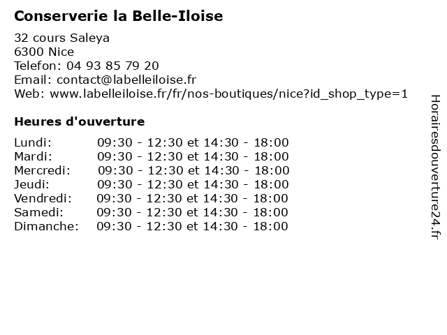 1 Conserverie la Belle-Iloise (Distance: 17,57 km) 28 rue de la République, 06600 Antibes alimentaion, belle, conserverie, conserves, iloise, la, magasin, plats cuisinés, sardine, thon 4 La Belle Cave (Distance: 1,06 km) 8 Rue Bavastro, 06300 Nice belle, boutique, cave, caviste, champagnes, la, spiritueux, vente, vins 5 Hôtel Belle Meunière (Distance: 1,30 km) 21 Avenue Durante, 06000 Nice bar, belle, hotel, hôtel, meunière, restaurant, service 6 Belle & Bio - Lavage Auto (Distance: 1,55 km) 15 Boulevard Du General Delfino, 06300 Nice auto, belle, bio, centres, lavage, station lavage, écologique |