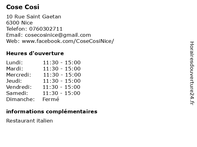 1 Cose Cosi (Distance: 0,00 km) 10 Rue Saint-Gaëtan, 06300 Nice cose, cosi, italien, pizza, restaurants, traditionnel 2 Cosi (Distance: 0,71 km) 16 rue de la Liberté, 06000 Nice cosi, decoration, magasins, meubles d, mobilier 3 L'Altro Cose Così (Distance: 2,68 km) 71 boulevard de Cimiez, 06000 Nice bar, bistro, bistrot, brasserie, café, cose, così, l'altro, restaurant, restauration 4 Cosi (Distance: 10,97 km) Rodrigue Thomas, 06800 Cagnes Sur Mer cosi, patrick, restaurants, rodrigue, thomas 5 Cosi'M (Distance: 11,43 km) 1 place de liberté, 06320 Cap-d'Ail brasserie, cosi'm, menus, restaurant, restauration 6 Cosi & Cosi (Distance: 14,54 km) 7 Avenue De France, 06190 Roquebrune-Cap-Martin alimentation, brasserie, cosi, parking, restaurant, terrasse |