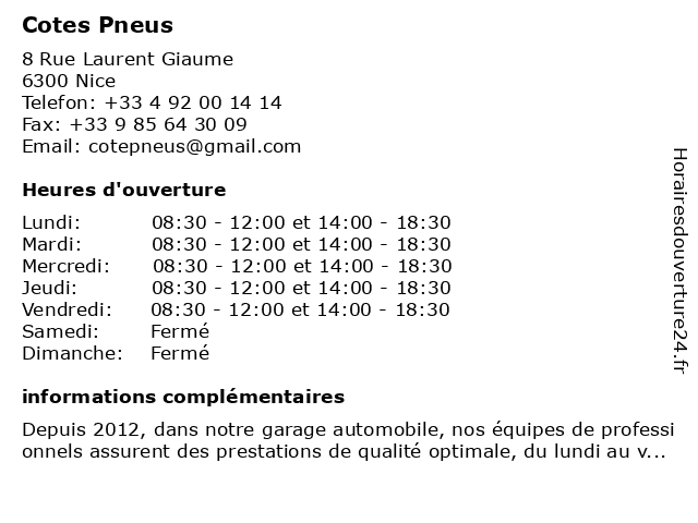 | Lundi | 08:30-12:00 et 14:00-18:30 |