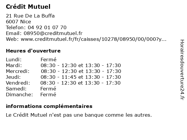 1 Crédit Mutuel (Distance: 0,02 km) 21 Rue de la Buffa, 06007 Nice agence, assurance, bancaire, banque, crédit, mutuel 2 Crédit Mutuel (Distance: 0,30 km) 455 Promenade des Anglais, 06000 Nice agence, assurance, bancaire, banque, crédit, mutuel 3 Crédit Mutuel (Distance: 0,54 km) 29 Avenue Jean Médecin, 06000 Nice agence, assurance, bancaire, banque, crédit, mutuel 4 Crédit Mutuel (Distance: 0,89 km) 19 Rue Pastorelli, 06000 Nice agence, assurance, bancaire, banque, crédit, mutuel 5 Crédit Mutuel (Distance: 0,95 km) 21 Rue Alexandre Mari, 06300 Nice agence, assurance, bancaire, banque, crédit, mutuel 6 Crédit Mutuel (Distance: 0,95 km) 21 Rue Alexandre Mari, 06300 Nice compagnie de téléphone, crédit, mutuel, organisme d'assurance |