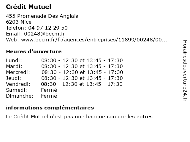 1 Crédit Mutuel (Distance: 0,06 km) 455 promenade des anglais, 06200 Nice argent, bancaire, credit, crédit, dépôt, mutuel, paiement, prêt 2 Crédit Mutuel (Distance: 1,74 km) 254 AVENUE DE LA CALIFORNIE, 06200 NICE crédit, l'argent, l'épargne, le crédit, les banques, les prêts, mutuel 3 Crédit Mutuel (Distance: 3,45 km) 24 Avenue de la Californie, 06200 Nice agence, assurance, bancaire, banque, crédit, mutuel 4 Crédit Mutuel (Distance: 5,14 km) 455 Promenade des Anglais, 06000 Nice agence, assurance, bancaire, banque, crédit, mutuel 5 Crédit Mutuel (Distance: 5,57 km) 29 Avenue Jean Médecin, 06000 Nice agence, assurance, bancaire, banque, crédit, mutuel 6 Crédit Mutuel (Distance: 5,96 km) 19 Rue Pastorelli, 06000 Nice agence, assurance, bancaire, banque, crédit, mutuel |