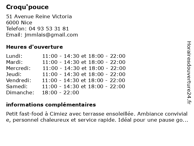 | Mercredi | 11:00-14:30 et 18:00-22:00 |