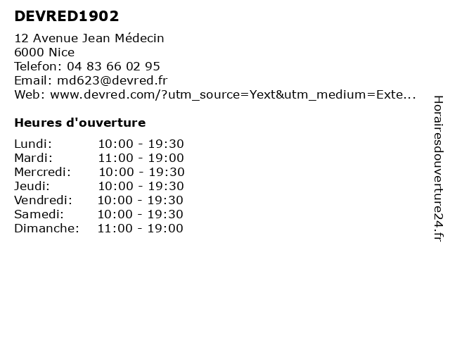 1 DEVRED1902 (Distance: 0,15 km) 30 Avenue Jean Médecin Cco Etoile, 06000 Nice devred1902, fabricant de prêt-à-porter, magasin de chaussures, magasin de smokings, magasin d’accessoires de mode, mode 2 DEVRED1902 (Distance: 0,57 km) 43 Avenue Jean Médecin, 06000 Nice devred1902, fabricant de prêt-à-porter, magasin de chaussures, magasin de smokings, magasin d’accessoires de mode, mode 3 DEVRED1902 (Distance: 12,03 km) Promenade Riviera Avenue Des Alpes Cc Shopping, 06800 Cagnes Sur Mer devred1902, fabricant de prêt-à-porter, magasin de chaussures, magasin de smokings, magasin d’accessoires de mode, mode 4 DEVRED1902 - Fermé (Distance: 1,52 km) 15 Boulevard Du Général Dolfino Cc Carrefour Tnl, 06300 Nice devred1902, fabricant de prêt-à-porter, fermé, magasin de chaussures, magasin de smokings, magasin d’accessoires de mode, mode 5 Fenêtre Imagine (Distance: 11,35 km) 918 Route Départementale 15, 06390 Contes aluminium, entreprise, fabricant, fenêtre, fenêtres, fênetres, imagine, pvc, société, volets, vérandas 6 FOM Industrie (Distance: 12,19 km) 7 Rue du Gabian, 98000 Monaco fabricant, fabrique, fom, industrie, manuel, monaco |