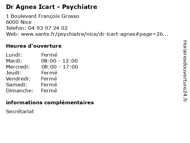 1 Dr Nicolas Lefebvre - Psychiatre (Distance: 0,25 km) 15 Rue Andrioli, 06000 Nice dr, lefebvre, nicolas, psy, psychiatre, sante, soins 2 Dr Ana Maria Lascu - Psychiatre (Distance: 0,41 km) 2 Avenue des Orangers, 06000 Nice 06000, ana, dr, lascu, maria, nice, psychiatre 3 Dr Anne Meynadier-Mariottini - Psychiatre (Distance: 1,04 km) 57 Avenue de la Californie, 06200 Nice anne, consultation, docteur, dr, mariottini, med, meynadier, médecin, psychiatre, traitement 4 Dr Philippe-Jean Parnot - Psychiatre (Distance: 1,04 km) 57 Avenue de la Californie, 06200 Nice consultation, docteur, dr, jean, med, médecin, parnot, philippe, psychiatre, traitement 5 Dr Hervé Caci - Psychiatre (Distance: 1,04 km) 57 Avenue de la Californie, 06200 Nice caci, consultation, docteur, dr, herve, hervé, med, médecin, psychiatre, traitement 6 Dr Nathalie Dugand - Psychiatre (Distance: 1,04 km) 57 Avenue de la Californie, 06200 Nice consultation, docteur, dr, dugand, med, médecin, nathalie, psychiatre, traitement |